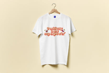 Feel the soft embrace of our adult cotton unisex tee, proudly featuring 'Positivity is my superpower.' Available in sizes XS-XL, it's your daily reminder to radiate optimism.